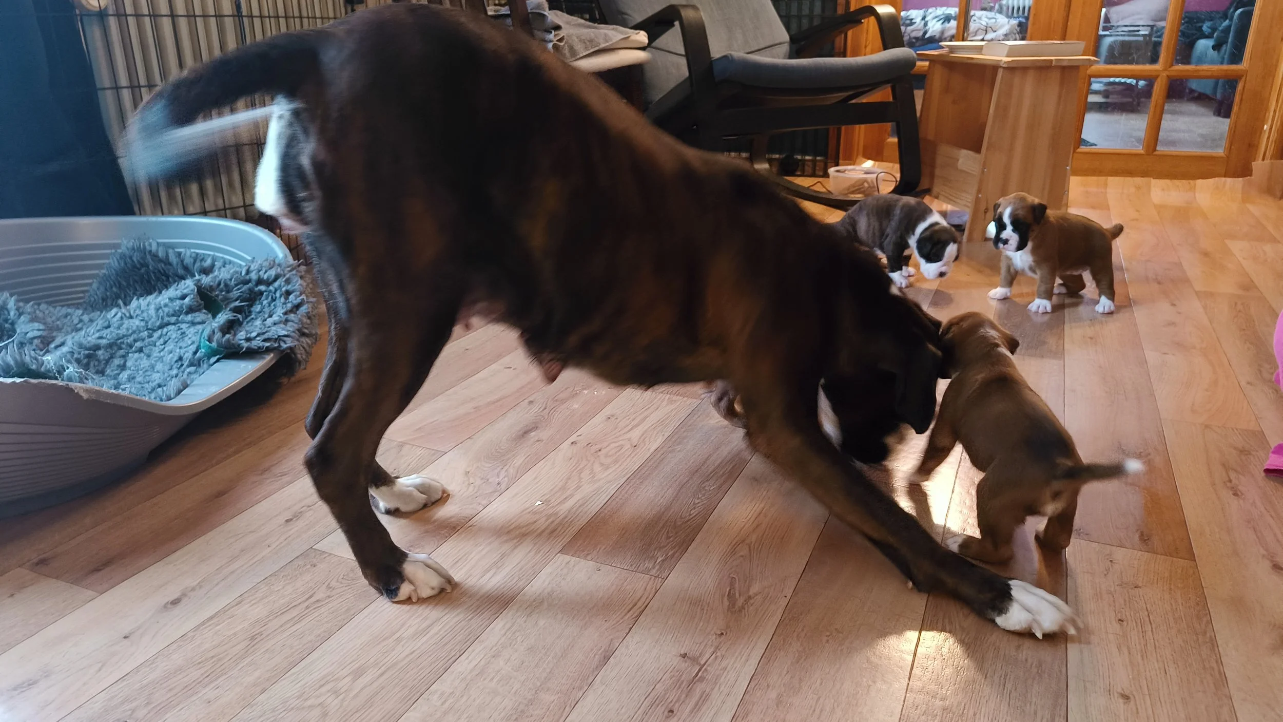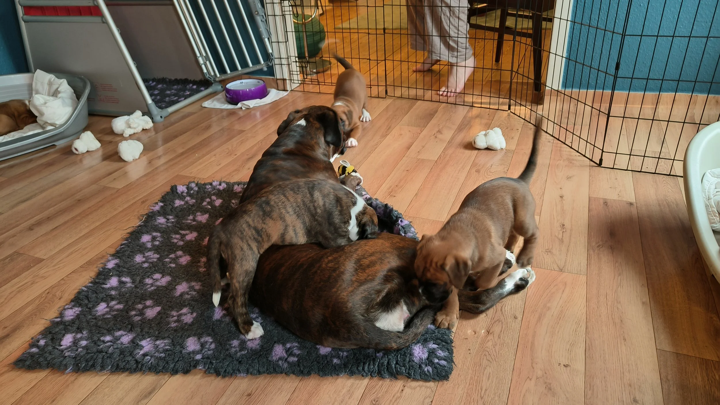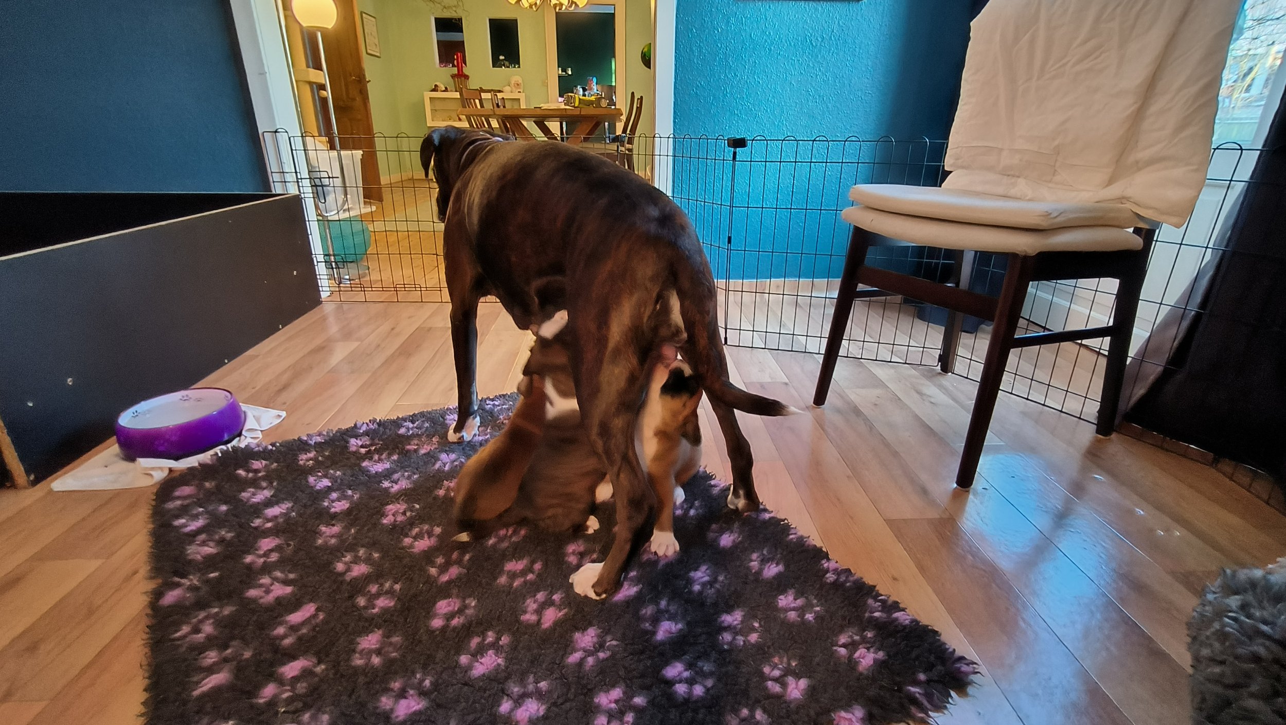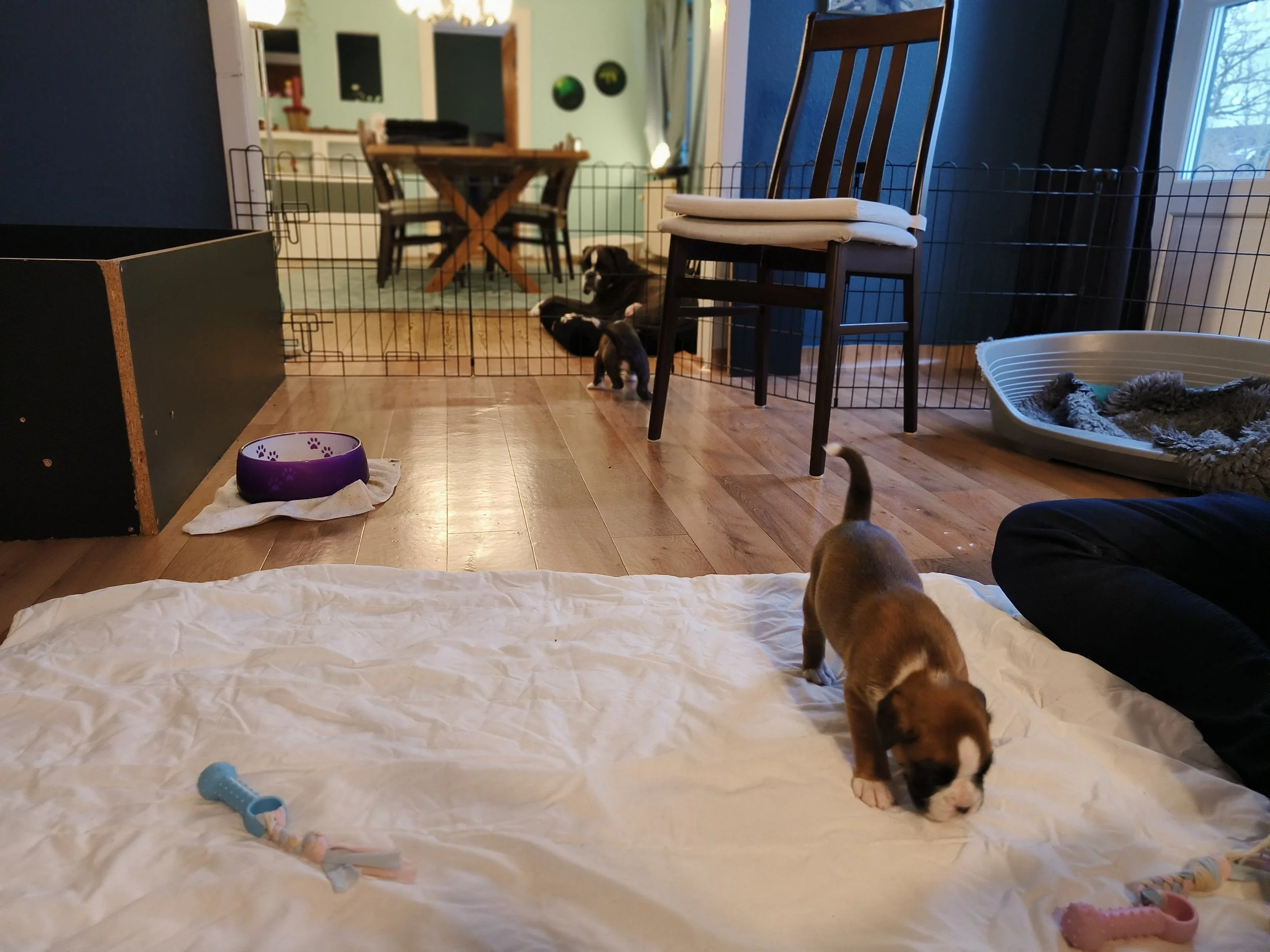 Am Ende Februar sind die Welpen 6 Wochen alt - und sie haben sich riesig entwickelt. Von total Abhängigkeit von ihrer Mutter zu eigenständigen Individuen, die immer noch gerne bei ihrer Mutter saugen, aber sonst Welpenfutter fressen, spielen, kämpfen, schlafen und mit Mutti schmusen. Auch für Juno ist viel geschehen - von total Fokus auf ihre Kinder zu einem mehr entspanntem Verhalten. Sie liegt gerne auf ihrem Kissen auf der anderen Seite des Zauns, so dass sie die Welpen überwachen kann ohne dass die saugen können. Aber sie spielt gerne mit den kleinen Cs, und sie ist richtig tüchtig sie zu erziehen. Diamond und Juno haben nicht viel Zeit zusammen verbracht - aber einmal haben wir uns zufällig getroffen, und dann haben beide Mädels sich sehr gefreut über einen Spaziergang zusammen. Und jetzt folgen viele Welpen Bilder - ja, ich weiss - aber trotzdem habe ich auch viele Bilder gelöscht…