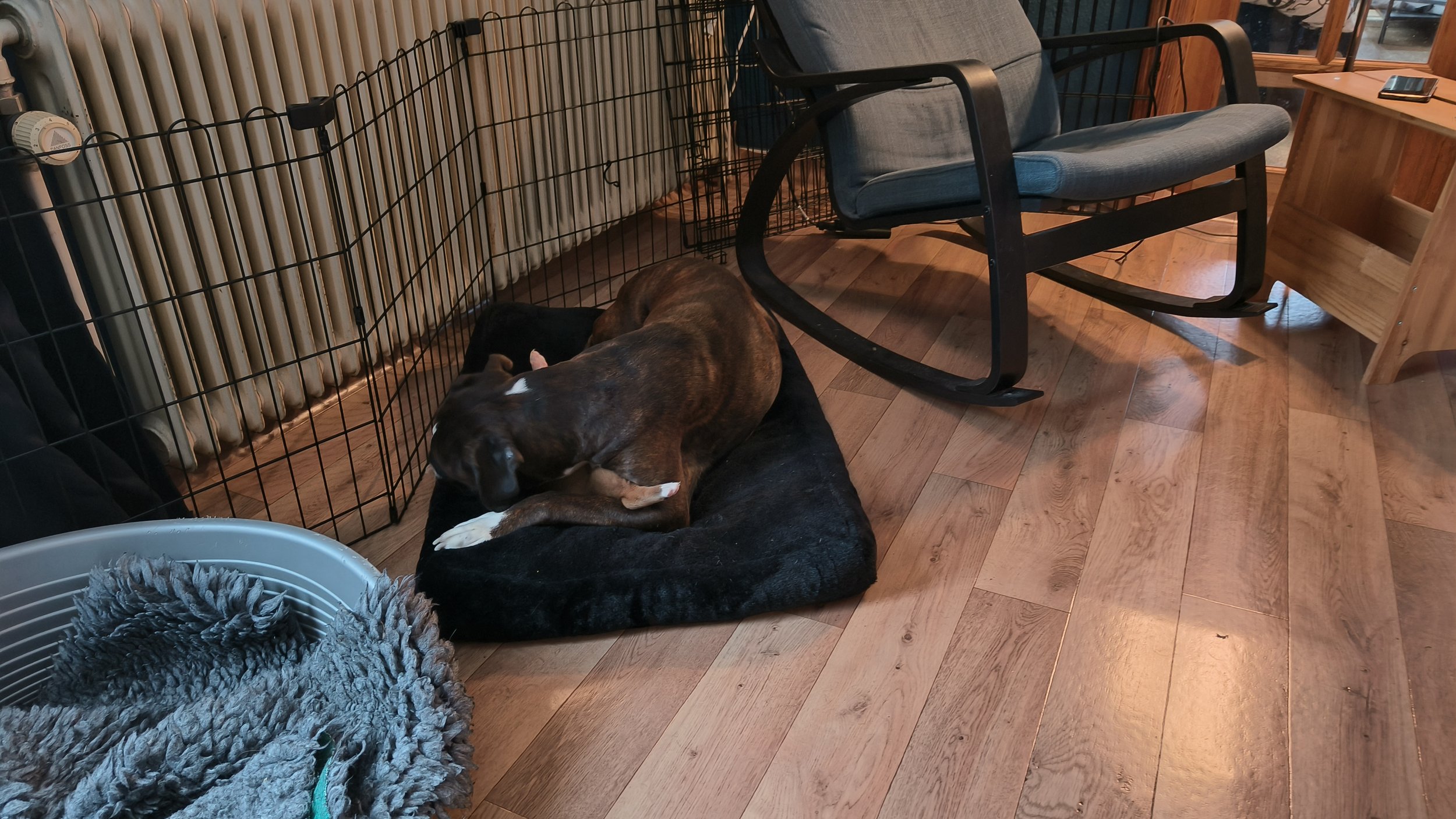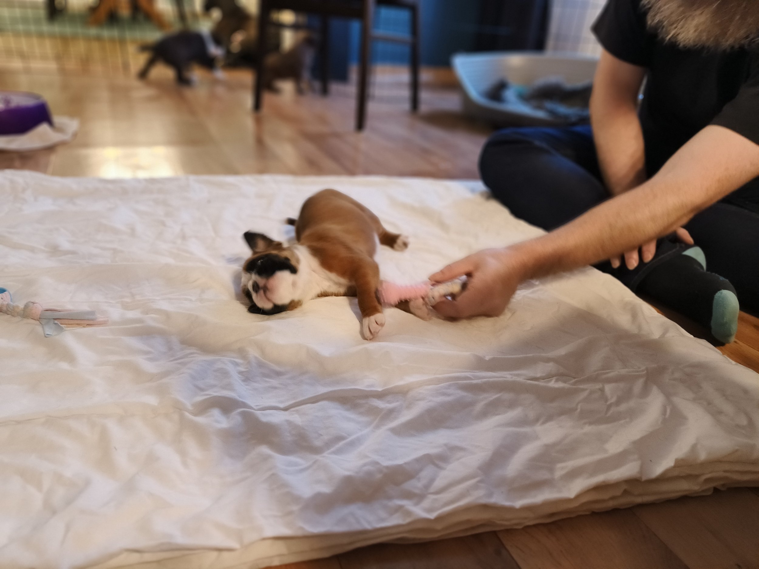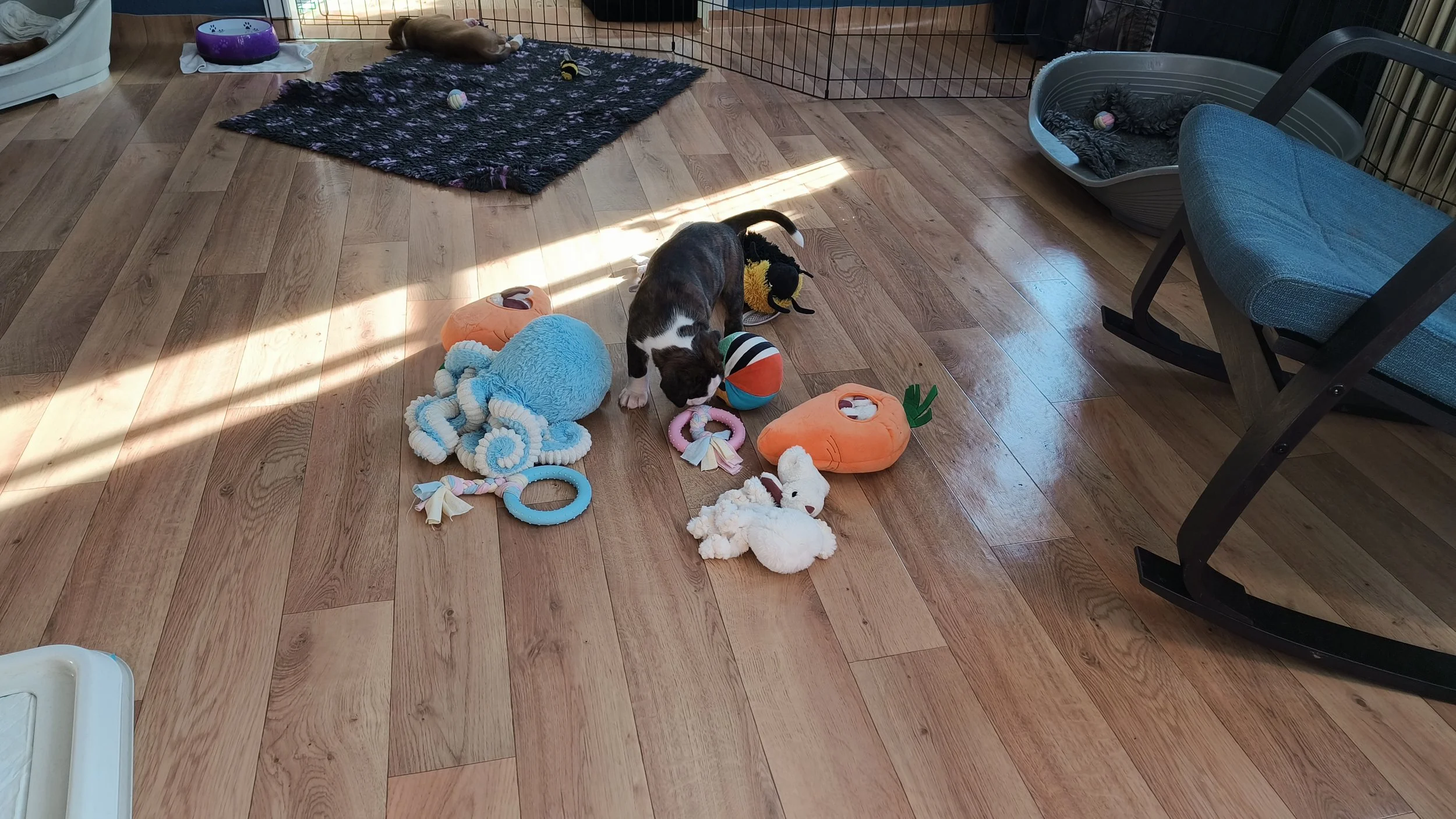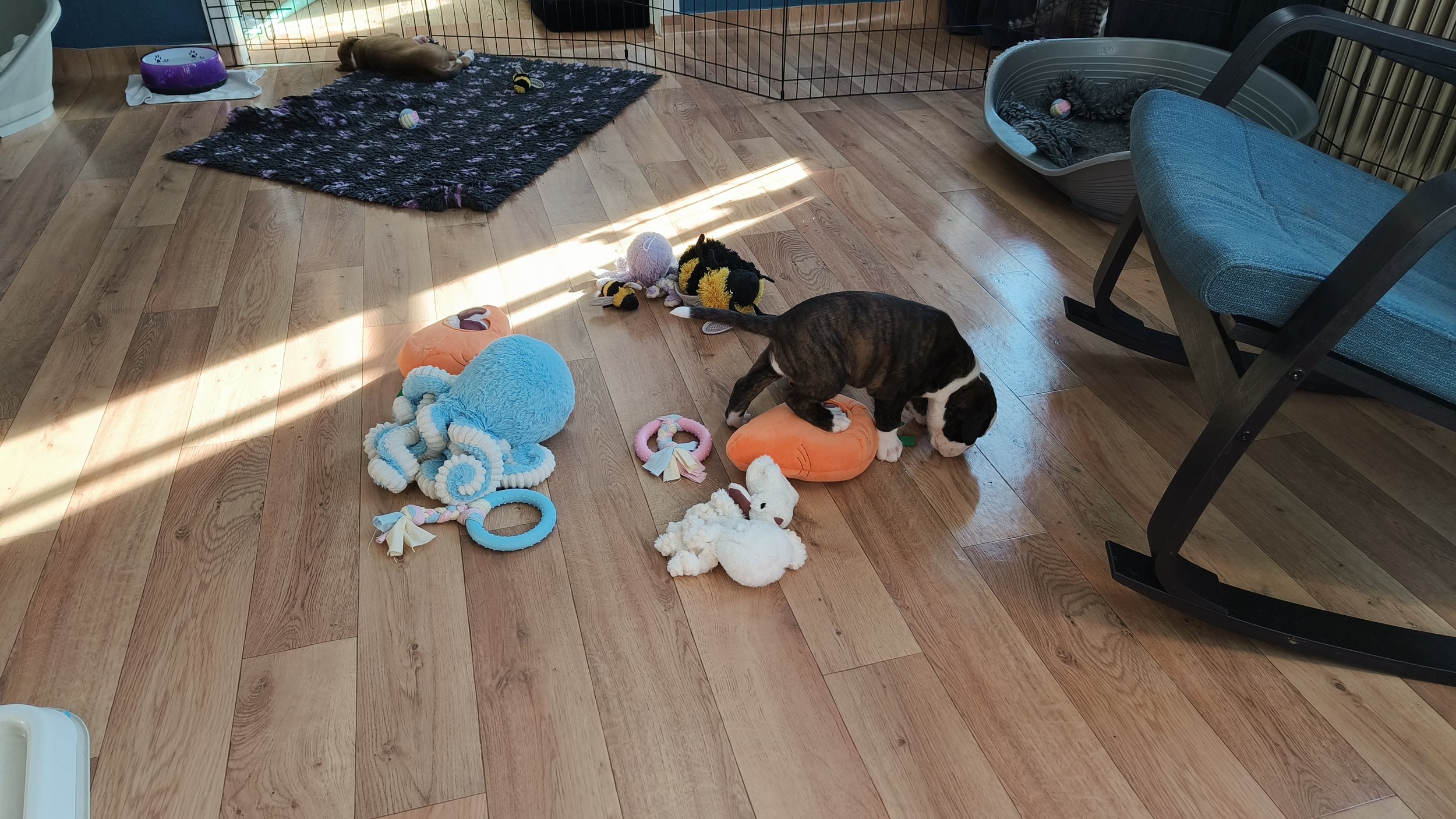 Am Ende Februar sind die Welpen 6 Wochen alt - und sie haben sich riesig entwickelt. Von total Abhängigkeit von ihrer Mutter zu eigenständigen Individuen, die immer noch gerne bei ihrer Mutter saugen, aber sonst Welpenfutter fressen, spielen, kämpfen, schlafen und mit Mutti schmusen. Auch für Juno ist viel geschehen - von total Fokus auf ihre Kinder zu einem mehr entspanntem Verhalten. Sie liegt gerne auf ihrem Kissen auf der anderen Seite des Zauns, so dass sie die Welpen überwachen kann ohne dass die saugen können. Aber sie spielt gerne mit den kleinen Cs, und sie ist richtig tüchtig sie zu erziehen. Diamond und Juno haben nicht viel Zeit zusammen verbracht - aber einmal haben wir uns zufällig getroffen, und dann haben beide Mädels sich sehr gefreut über einen Spaziergang zusammen. Und jetzt folgen viele Welpen Bilder - ja, ich weiss - aber trotzdem habe ich auch viele Bilder gelöscht…